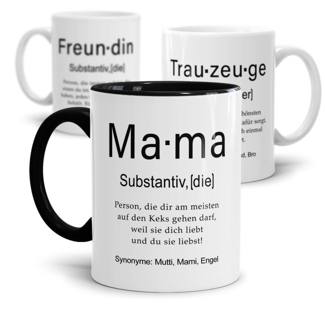 Unsere lustigen Kaffeebecher -Dudenwörter- umschreiben bestimmte Personen etwas anders - liebevoller und witziger und oft treffender als der Duden - Eine nette Geschenkidee für Freunde, Kollegen und Familienmitglieder zu jedem Anlass. Das bringt zusätzlich gute Laune in der wohl verdienten Kaffeepause. Unsere individuell bedruckbaren Tassen passen in jeder Lebenslage. Ob im Büro, für zuhause oder als Geschenk für die Liebsten oder den Kollegen – mit dem richtigen Spruch drauf, wird sie zum neuen Lieblingsstück. Alle Farben kommen äußerst realistisch, lebhaft und brillant glänzend aus unser hauseigenen Produktion.