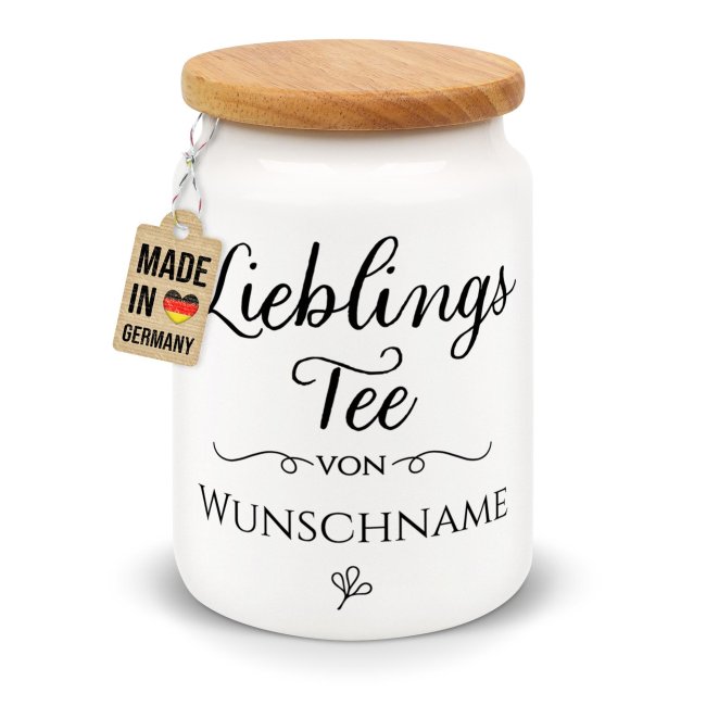 Diese Dose vereint Funktionalität mit Stil - der elegante Schriftzug "Lieblings-Tee von" macht sie zum dekorativen Highlight in der Küche. Das perfekte Präsent für Tee-Liebhaber - ideal als Geburtstagsgeschenk, als Geschenk zur Wohnungseinweihung oder einfach als persönliche Aufmerksamkeit. Für die Familie, Freunde oder Kollegen - eine hochwertige Aufbewahrungsdose mit Namens-Personalisierung. Eine hervorragende Geschenkidee für Teejunkies.