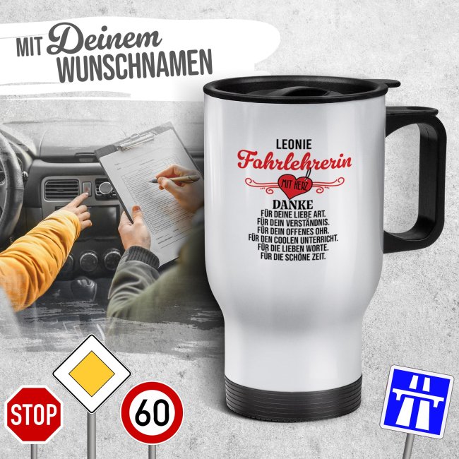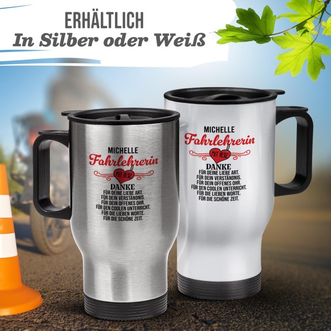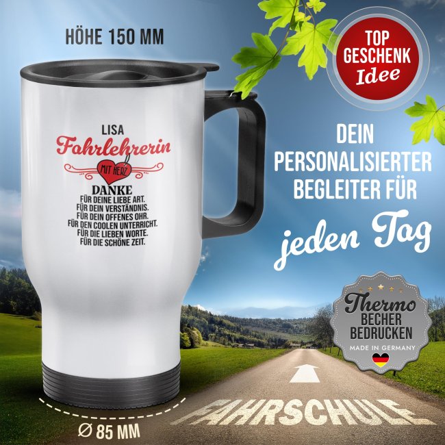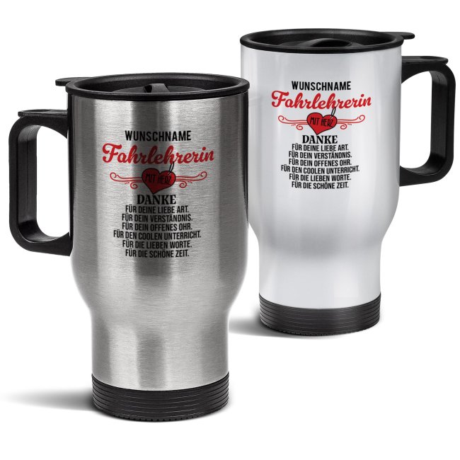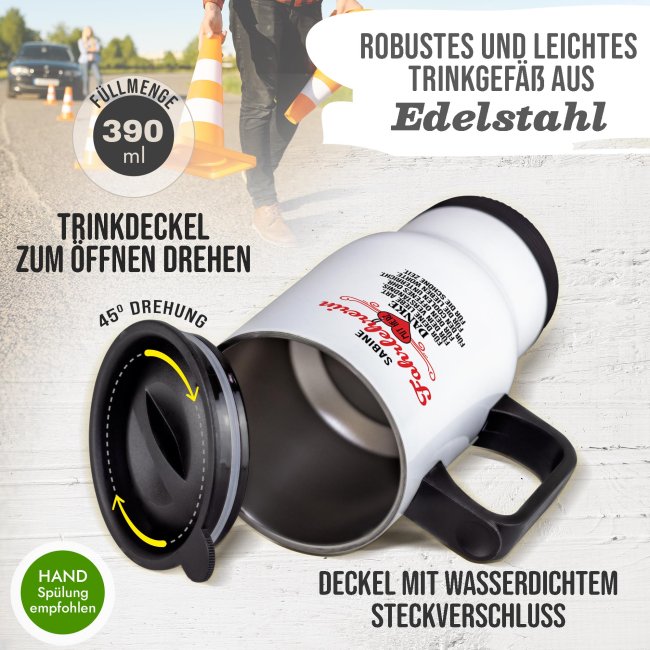 Ob während der Fahrstunde im Auto oder bei einem Spaziergang - unser hochwertiger Edelstahl-Thermobecher für Fahrlehrerinnen mit Spruch - Fahrlehrerin mit Herz, von der alle reden - liefert das gewünschte Getränk - heiß oder kalt. Mit deinem Wunschnamen wird der Becher zum neuen Lieblingsstück. Für alle, die auf der Suche nach einem langlebigen und praktischen Thermobecher sind, bietet unser Truckerbecher mit Griff die perfekte Lösung. Die perfekte Geschenkidee für die beste Fahrlehrerin zum Geburtstag oder einfach mal um Danke zu sagen. Für alle Fahrlehrerinnen, die viel unterwegs sind - umweltfreundlich und nachhaltig.