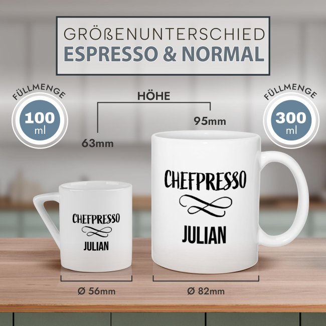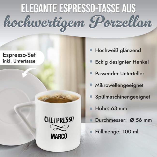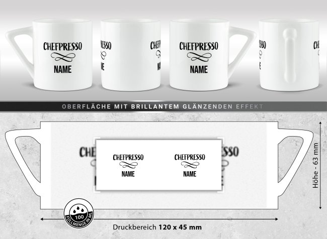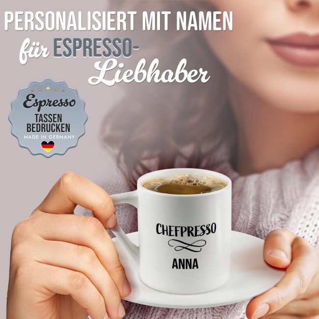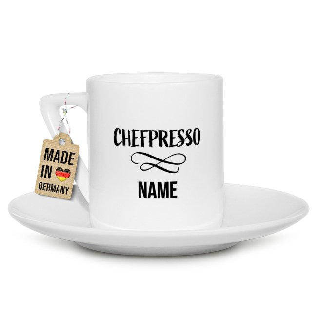 Chefpresso - Der Espresso für die wahre Chefetage - mit dieser stylischen Espresso Tasse weiß jeder, wer hier das sagen hat. Mit dem Namen personalisiert, weiß auch jeder, wem die Tasse gehört, damit auch ja keiner auf die Idee kommt, die Tasse zu klauen. Die hochwertige Tasse aus Porzellan (100 ml) inklusive Untertasse für den stilvollen Auftritt, ist ein tolles Geschenk für Espresso-Junkies und ein ideales Geburtstagsgeschenk für Freunde, die Kollegen oder den Chef. Eine kleine Tasse - die durch Ihre Personalisierung einen ganz großen Auftritt bekommt.
