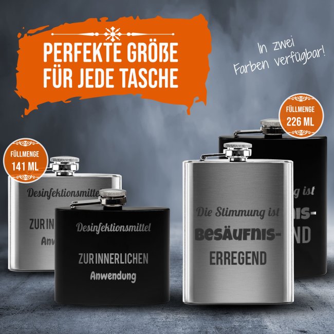 Ein Flachmann - auch Taschenflasche genannt - ist mittlerweile ein treuer Begleiter von Wanderen, Skifahrern und Outdoor-Begeisterten. Der kleine Schluck seines Lieblingsgetränks zwischendurch aus dem praktischen Edelstahl Flachmann macht vor allem dann besondere Freude, wenn der Flachmann mit Gravur versehen ist. Ein wirklich edles Geschenk für Männer und auch Frauen mit persönlicher Note - eine besondere Geschenkidee zum Vatertag, zu Weihnachten, zum Jubiläum, zur Hochzeit oder zum Geburtstag. Praktisch, platzsparend und persönlich macht dieses personalisierte Gravurgeschenk besonders viel her. Lass den Flachmann mit Deinem persönlichen Wunschtext gravieren und wähle zwischen zwei Größen und Farben.