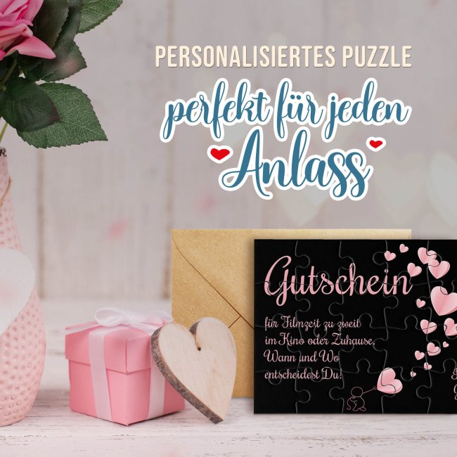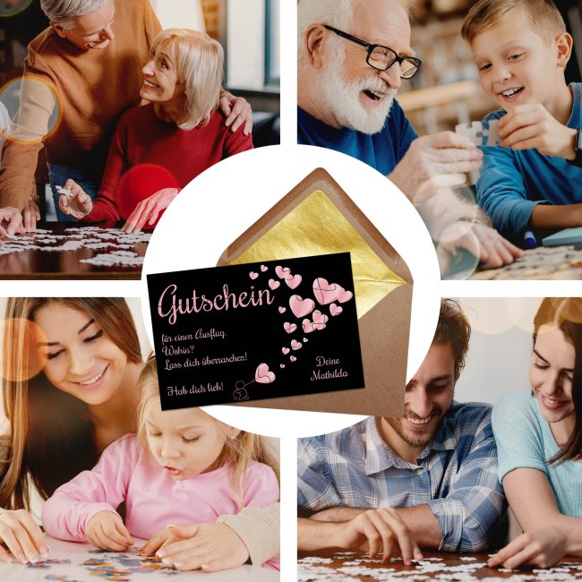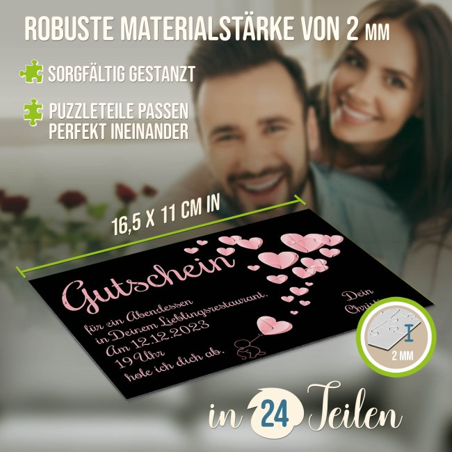 Ein personalisiertes Puzzle als Gutschein aus 24 Teilen ist das optimale Geschenk für beste Freundinnen, den Partner, Familie und Freunde - passend zu jedem Anlass. Überrasche all deine Lieblingsmenschen mit dem selbst gestalteten Gutschein in Puzzle-Form zum Geburtstag, zum Jubiläum oder einfach um Danke zu sagen. Mit deinem 5-zeiligen Wunschtext kannst du dein Puzzle ganz einfach personalisieren. Eine persönliche und kreative Geschenkidee, wenn Stück für Stück der ganz spezielle Gutschein gepuzzelt wird - Tolle Überraschung für alle Lieblingsmenschen - Das Puzzle wird mit einem schönen Kraftkarton Briefumschlag mit edlem Gold-Inlay geliefert. Perfekt zum Verschenken und Verschicken. perfekt geeignet.