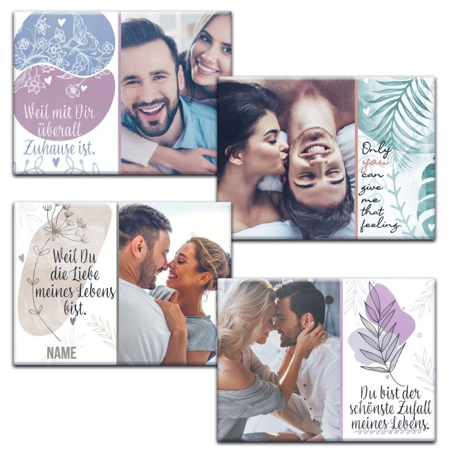Diese liebevoll gestalteten Fotomagnete mit schönen Sprüchen und eigenen Fotos zum selbst Gestalten sind eine originelle und praktische Geschenkidee für den Partner oder die Partnerin zum Geburtstag, als Valentinstagsgeschenk oder Geschenk zum Jahrestag. Die praktischen Kühlschrankmagnete halten nicht nur Eure Notizen fest, sondern sie wecken Erinnerungen an gemeinsame, unvergessliche Augenblicke.