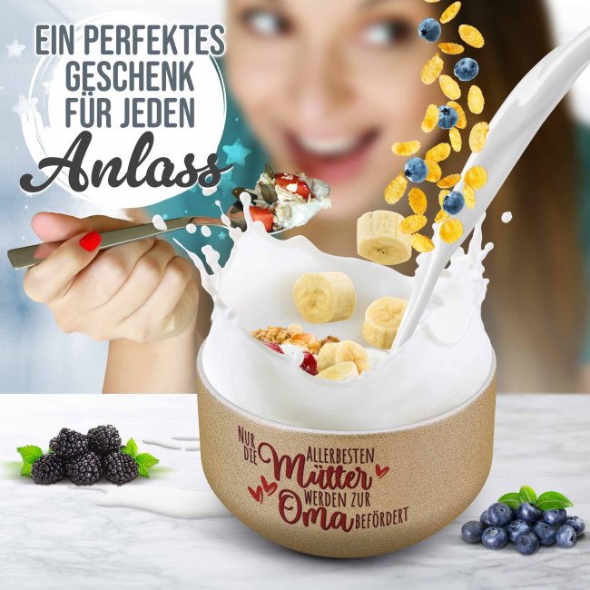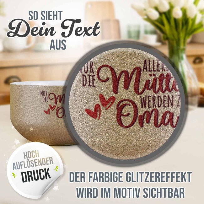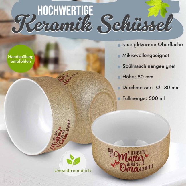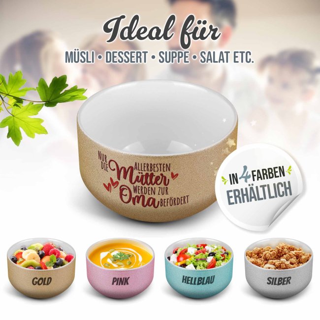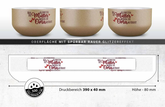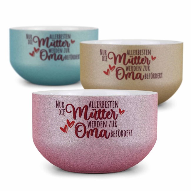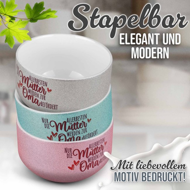 Unsere Glitzer-Schüssel mit Spruch " Nur die allerbesten Mütter, werden zur Oma befördert" ist ein liebevolles Geschenk an zukünftige Omas oder bereits stolze Omas. Die stilvolle Schale im zeitlosen Design zaubert jeden Tag ein Lächeln ins Gesicht. Die Müslischale mit rauer glitzernder Oberfläche ist ein unverwechselbares Geschenk für zukünftige Omas zur Ankündigung des Nachwuchses, zum Geburtstag oder Muttertag. Ein täglicher Begleiter für die beste Oma, perfekt um gemütlich in den Tag zu starten.