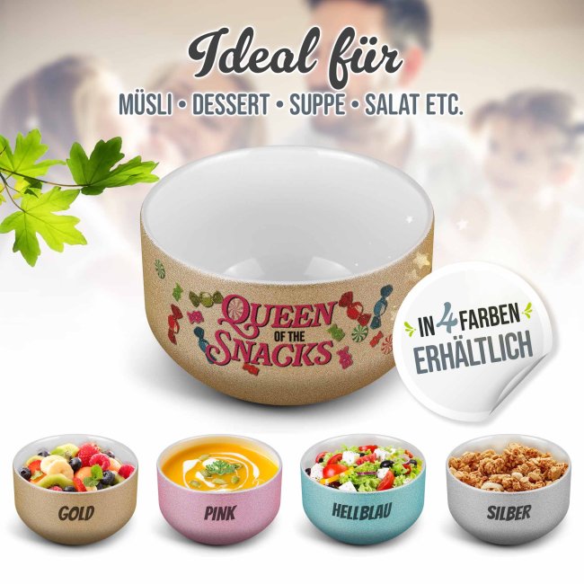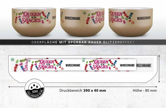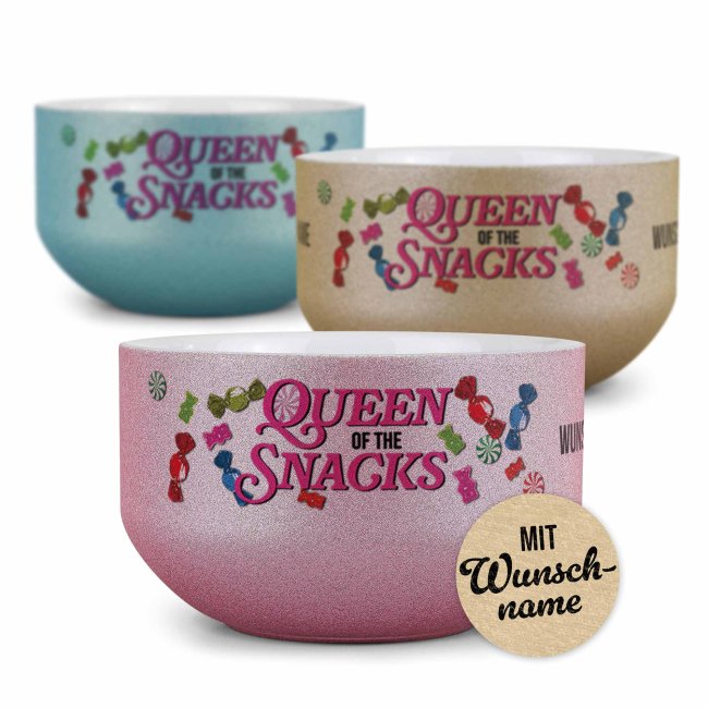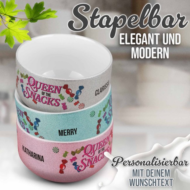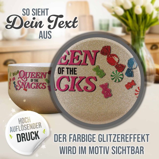 Die Glitzer-Müslischale "Queen of Snacks" kann mit deinem Namen beschriftet werden - Eine tolle Möglichkeit, dem alltäglichen Frühstück eine persönliche Note zu verleihen. Die personalisierte Müslischüssel mit Glitzereffekt ist nicht nur funktional für Müsli, Suppe, Joghurt oder Snacks, sondern auch ein besonderes Geschenk für die beste Freundin, Schwester, Nachbarin oder Kollegin. Bedruckt mit deinem Wunschnamen wird jede Mahlzeit zu einem persönlichen Erlebnis, das den Tag mit einem Lächeln beginnen lässt. Die Müslischale mit glitzernder Oberfläche ist ein absolutes Unikat.