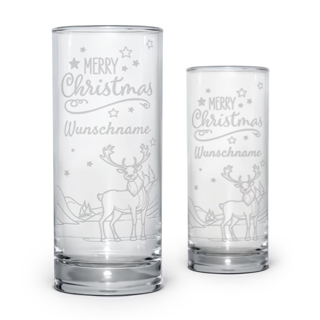 Gestalten Sie ein festliches Trinkglas mit einer individuellen Gravur, perfekt für die Weihnachtszeit. Das gravierte Trinkglas mit weihnachtlichem Design - Merry Christmas Rentier - wird mit Ihrem Wunschname graviert und erhält so eine ganz persönliche Note. Unser graviertes Glas ist das ideale Weihnachtsgeschenk für Freunde, Familie oder Kollegen. Ob als liebevolle Überraschung oder als festliches Highlight auf der Weihnachtstafel - das personalisierte Glas verleiht jedem weihnachtlichen Getränk eine persönliche Note und sorgt für stimmungsvolle Momente.