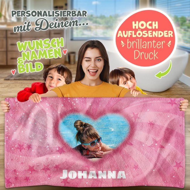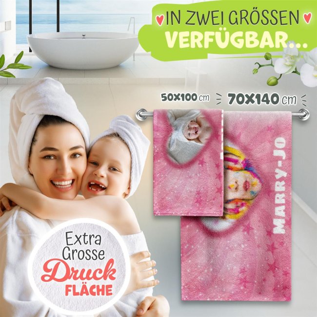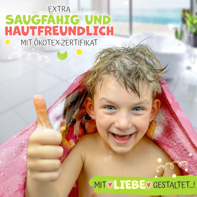 Du suchst ein schönes und praktisches Geschenk für dein Kind, Enkelkind oder Nichte? Dann ist dieses süße Strandtuch für Mädchen genau das Richtige! Das personalisierte Handtuch wird mit dem Lieblingsfoto und dem Namen des Kindes bedruckt und wird somit zum idealen Begleiter und darf in keinem Koffer fehlen. Aber nicht nur im Urlaub ist das persönliche Badetuch praktisch, sondern auch beim Schwimmunterricht und nach dem Baden zu Hause. Das neue Lieblingsstück für kleine Badenixen. Unser hochwertiges Handtuch ist nicht nur kuschelig-weich sondern auch strapazierfähig und langlebig - brillanter Farbdruck inklusive. Mach deiner kleine Prinzessin eine Freude mit diesem personalisierbaren Kinderhandtuch - auch eine wunderbare Geschenkidee zum Geburtstag, Weihnachten, Kindertag oder als kleines Mitbringsel.