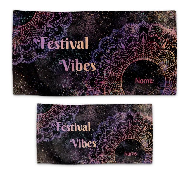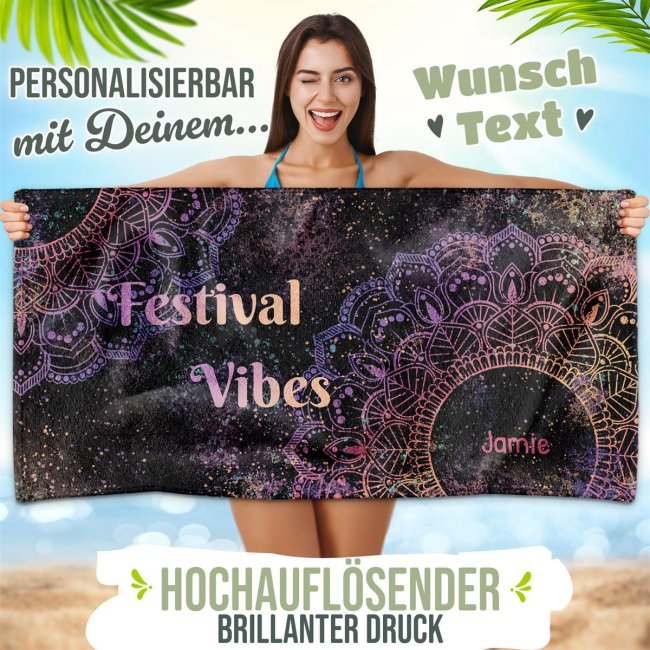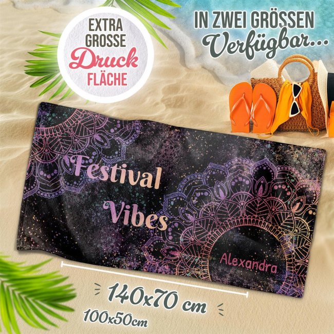 Sommerzeit ist Festivalzeit! Mit unserem Badehandtuch mit dem Aufdruck - Festival Vibes - zeigst du wer hier richtig rockt! Das Strandtuch wird mit deinem Wunschname oder Wunschtext bedruckt. Mit dem personalisierten Badetuch weiß jeder wer die beste Festival-Crew auf dem Festival ist. Dieses Strandtuch, ist auf jeden Fall der Hingucker bei jedem Konzert, im Sommer-Urlaub oder auch im Fitnessstudio oder Sauna. Auch als Geschenkidee für Freunde zum Geburtstag ideal. In unserem Designer kannst du dein individuelles Fotohandtuch kinderleicht gestalten -Probiere es doch mal aus!