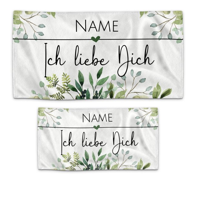 Ein personalisiertes Handtuch - Ich liebe dich - bedruckt mit dem Namen ist ein echter Hingucker, ob zu Hause, im Urlaub oder beim Sport. Das Badetuch ist die ganz besondere Geschenkidee für Paare, Verliebte, für Mann und Frau, ob zum Valentinstag, Jahrestag, Geburtstag oder Weihnachten. Das bedruckte Strandtuch im Querformat mit Name ist ein individuelles und praktisches Geschenk passend zu jedem Anlass. Du kannst zwischen zwei verschiedenen Handtuch-Größen wählen. Die Vorderseite des Handtuchs besteht aus 100% bedruckbarer Mikrofaser und die Rückseite aus Baumwolle. Dank dieser Materialkombination vereint das Handtuch ein angenehmes Gefühl auf der Haut mit einer langlebigen und brillanten Druckqualität. Es kann problemlos bei 40°C gewaschen werden.