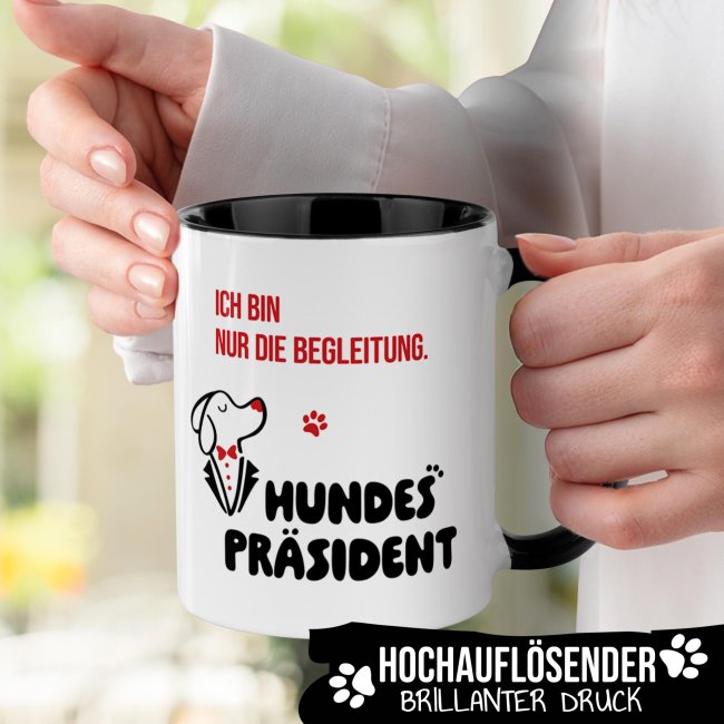 Ich bin nur die Begleitung - aber immerhin mit Koffeinversorgung. Der Hundespräsident gibt die Richtung vor, die Halterin oder der Halter folgt - und trägt die Tasche. Diese Tasse bringt genau das auf den Punkt: charmante Selbstironie für alle, die wissen, wer wirklich regiert. Hochwertige Keramik, 300 ml, spülmaschinenfest - bereit für diplomatische Kaffeepausen. Ein humorvolles Bekenntnis zum eigenen Status: wichtig, aber zweitrangig.