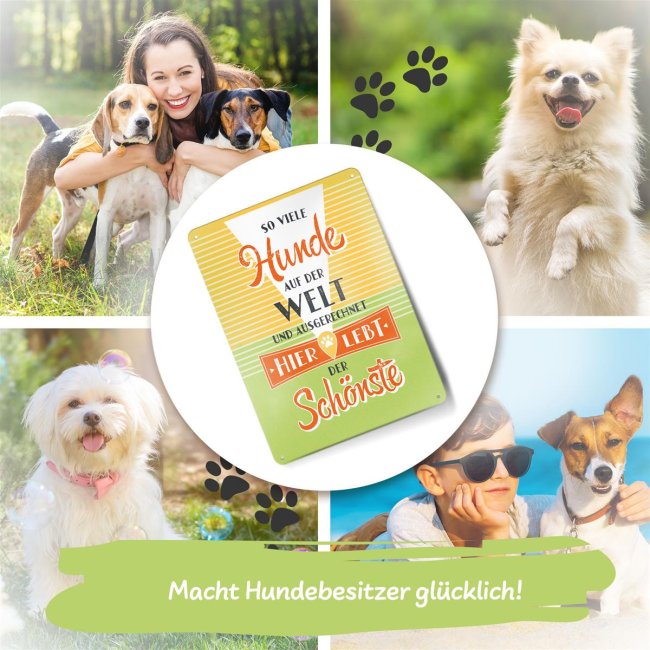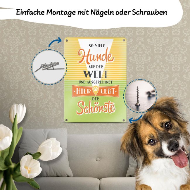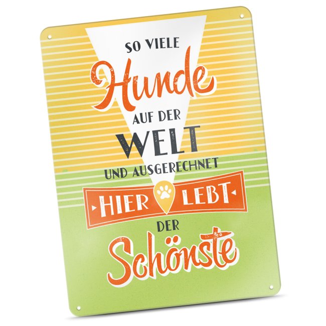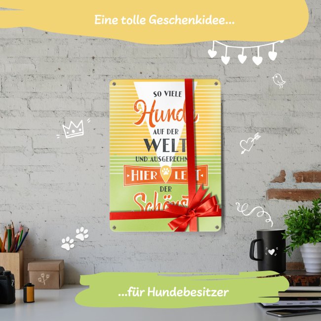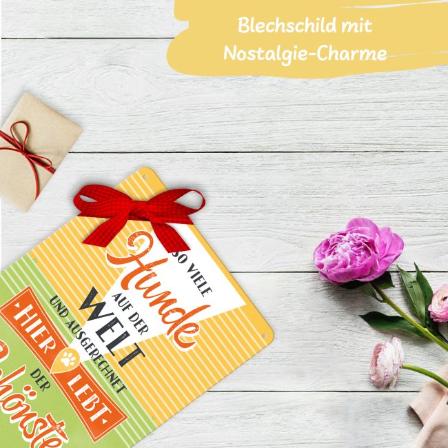 Liebevoll gestaltetes Metallschild mit schönem Spruch - Hier lebt der schönste Hund - für Hundebesitzer oder Hundeliebhaber. Dieses Schild ist das perfekte Geschenk für Hundefreunde zum Geburtstag, zu Weihnachten und zu jedem weiteren Anlass. Verschenke dieses schöne Blechschild und mache allen Hundebesitzern eine große Freude. Unser Metallschild verleiht einen nostalgischen Charme im Retro-Flair. Egal ob als Dekoration an der Wand, ob als Metallp9ster auf einer Kommode, oder direkt über dem Körbchen - ein echter Hingucker!