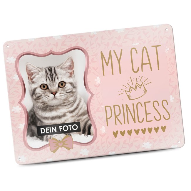 Liebevoll gestaltetes Katzenschild personalisierbar mit Katzenfoto und lustigem Spruch - My cat princess. Wer ein besonderes Geschenk für eine Katzenbesitzerin sucht, der findet mit unserem Metallschild mit süßem Katzenspruch genau das Richtige. Ob als Türschild oder als witzige, dekorative Wandtafel für den Wohnraum oder den Futterplatz und Schlafplatz der Katze sorgt unser Katzenschild für Aufmerksamkeit. Lade einfach das Lieblingsbild Deiner Katze hoch und fertig ist das dekorative Schild für die Katzenfreundin.