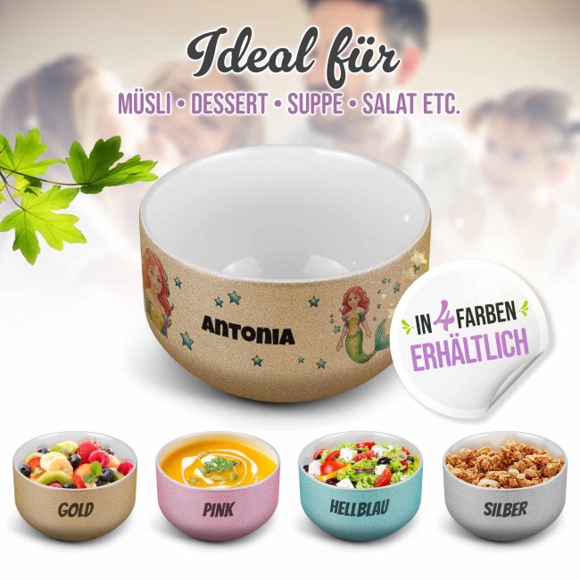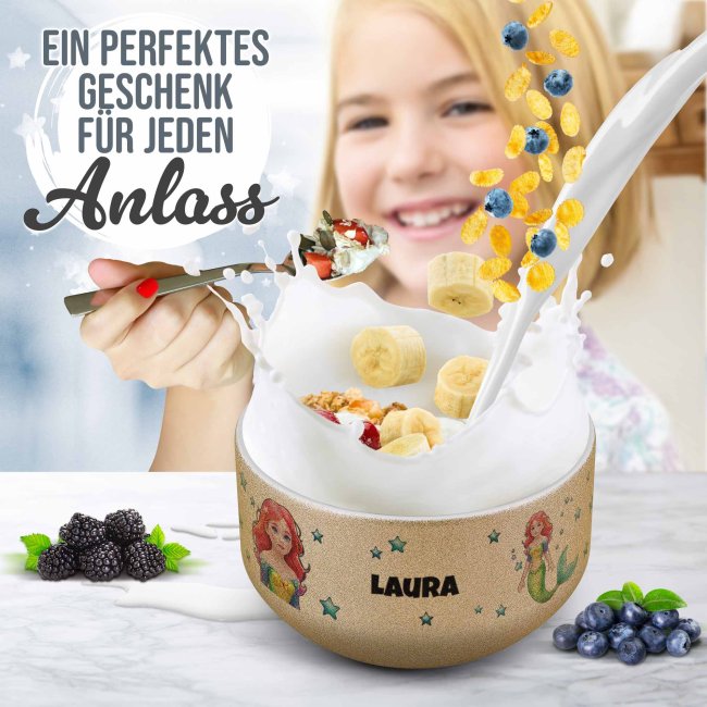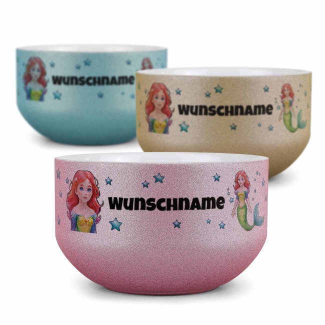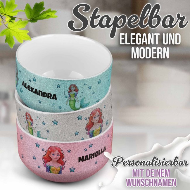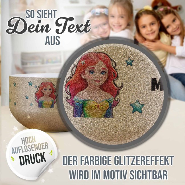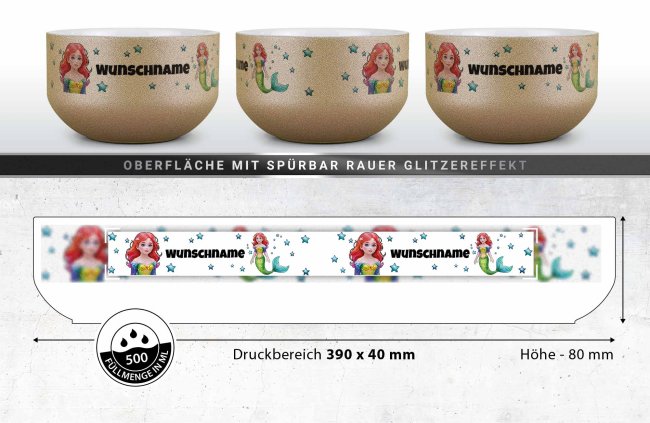 Tauche ein in die zauberhafte Unterwasserwelt mit unserer Glitzer-Schüssel für Kinder im Meerjungfrau-Design! Mit ihrem funkelnden Glitzer und dem bezaubernden Motiv einer Meerjungfrau wird jede Mahlzeit zu einem märchenhaften Erlebnis. Die Schale ist mit dem Namen des Kindes personalisierbar und wird so zu einem ganz besonderen Geschenk zum Geburtstag, Kindertag oder zur Einschulung. Die glitzernde Müslischüssel für Kinder!