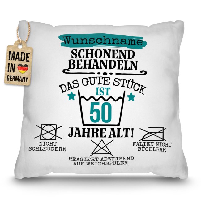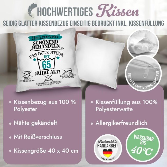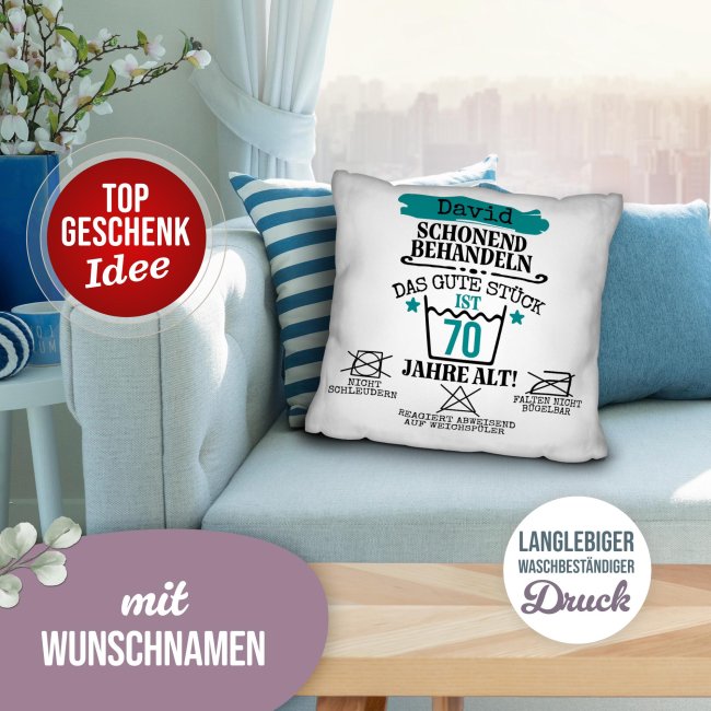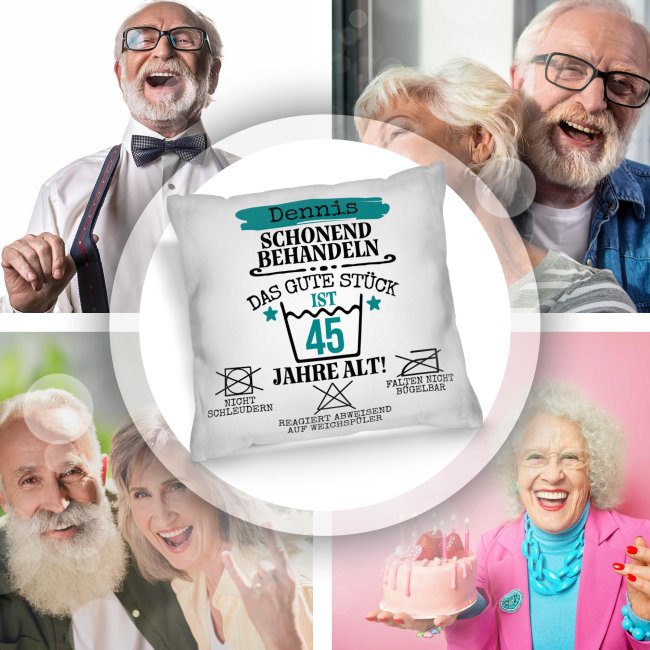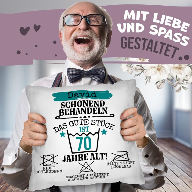 Dieses personalisierbare Kissen ist ein echter Hingucker - genau wie das Geburtstagskind! Ideal als humorvolles Geschenk zum Geburtstag, überzeugt das Kissen mit einem witzigen Design, das liebevoll erinnert: "Schonend behandeln, das gute Stück ist X Jahre alt!". Das weiße Kissen wird mit Ihrem Namen und der Zahl personalisiert und ist daher eine unverwechselbare Geschenkidee zum Geburtstag für alle Männer - ob Familie, Freunde oder Kollegen. Das personalisierte Kissen wird komplett mit passender Kissenfüllung geliefert. Durch den hochwertigen Fotodruck kommen alle Farben äußerst realistisch, lebhaft und brillant aus unserer hauseigenen Produktion - Made in Germany. Ein wunderbares Geschenk zum Geburtstag - werden Sie noch heute kreativ und gestalten Sie hier Ihr Kissen!
