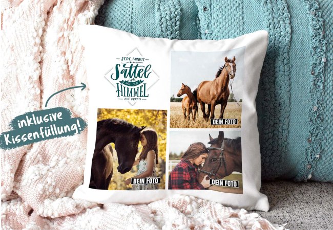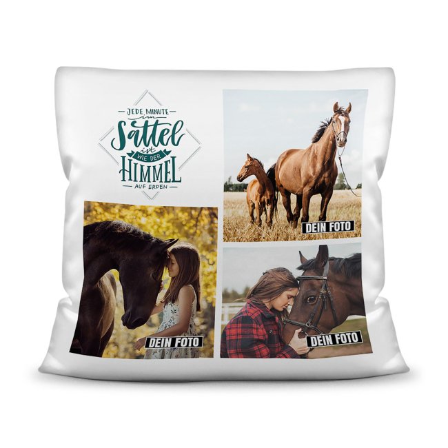 Originelles Zierkissen mit drei Fotos selbst gestalten - Himmel auf Erden - ein Muss auf dem Sofa - für jeden Pferdebesitzer und Pferdeliebhaber. Dieses personalisierte liebevoll designte Kissen für alle Pferdemenschen ist eine perfekte Geschenkidee zum Geburtstag, als Geschenk zu Weihnachten und zu jedem weiteren Anlass.