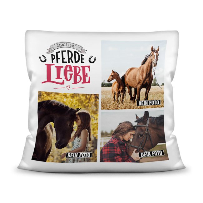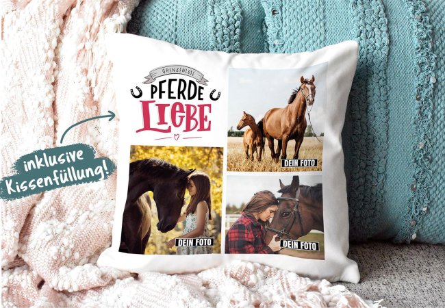 Originelles Zierkissen mit drei Fotos selbst gestalten - Pferdeliebe - ein Muss auf dem Sofa - für jeden Pferdebesitzer und Pferdeliebhaber. Dieses personalisierte liebevoll designte Kissen für alle Pferdemenschen ist eine perfekte Geschenkidee zum Geburtstag, als Geschenk zu Weihnachten und zu jedem weiteren Anlass.
