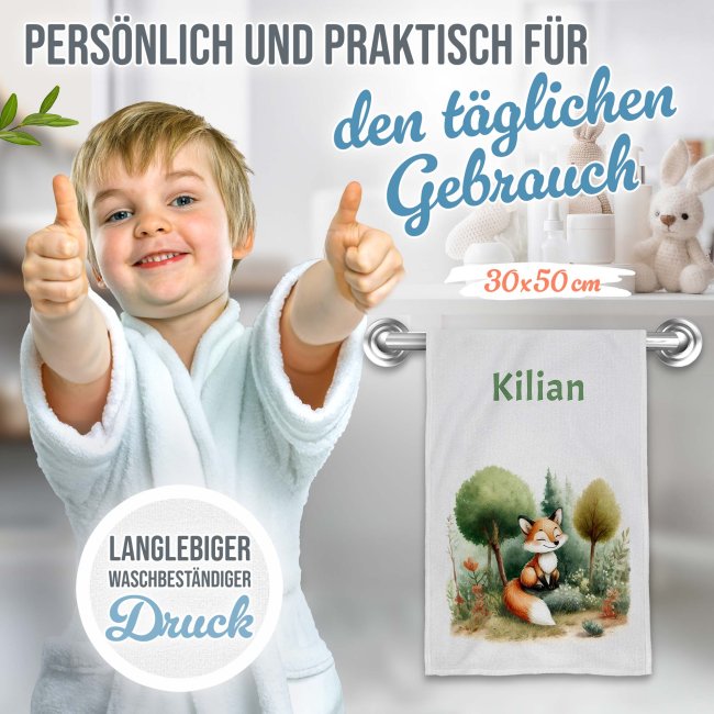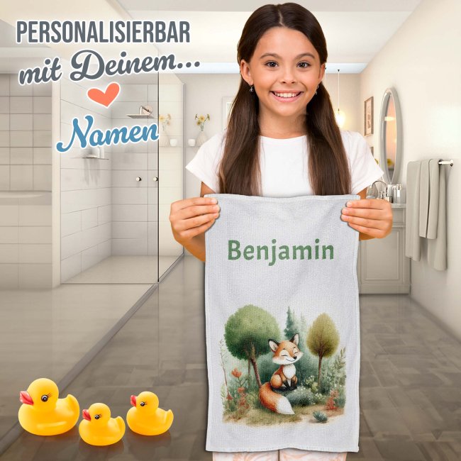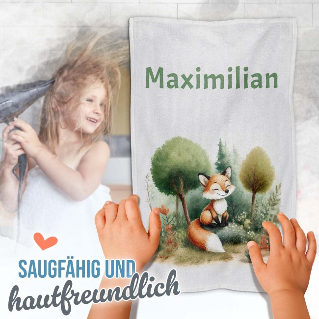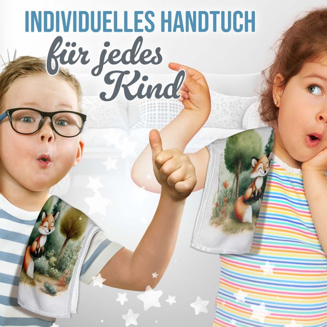 Das liebevoll gestaltete kleine Kinder-Handtuch "Fuchs im Wald" kannst Du mit einem Namen in unserem Produktdesigner ganz einfach personalisieren. Das kleine Namenshandtuch in der Größe 30 x 50 cm ist perfekt als kleines Reisehandtuch zum Mitnehmen geeignet - auch für die Kita ist das kleine Kinderhandtuch ein besonderes Utensil. Ein besonderes und praktisches Geschenk für Kinder zum Kindertag, Geburtstag oder einfach mal zwischendurch. So gibt es kein Verwechseln mehr!