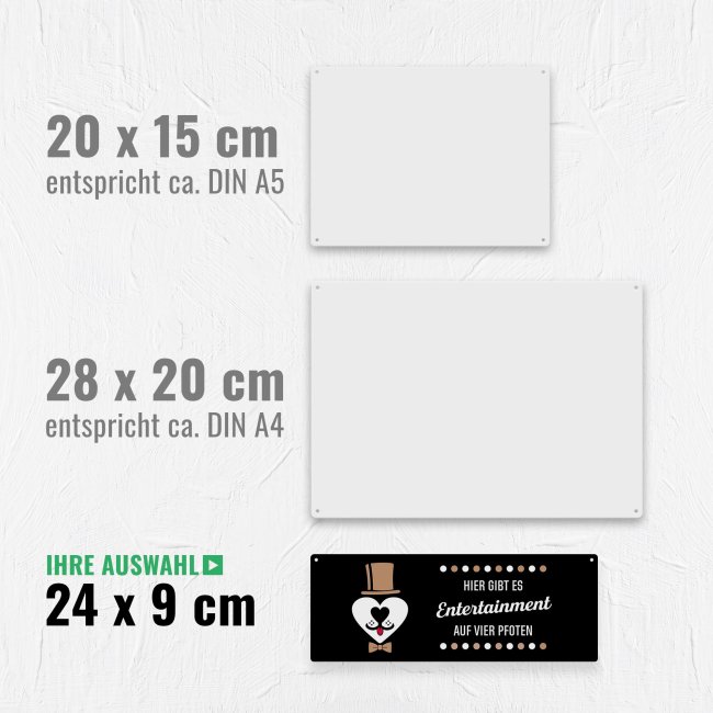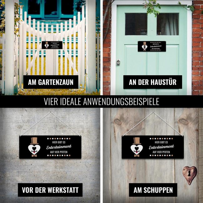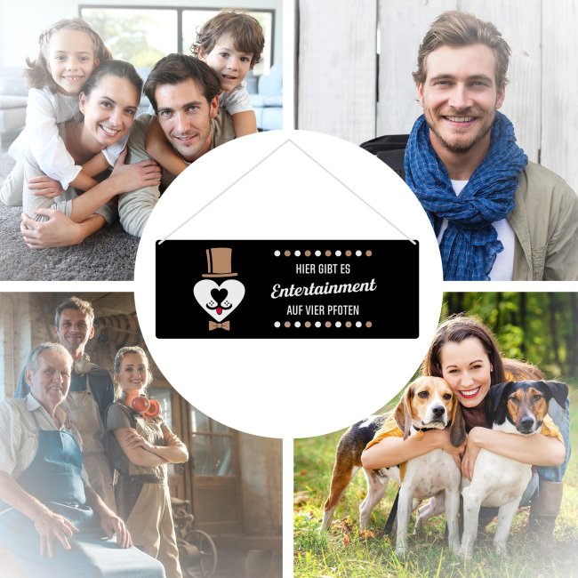 Bedrucktes Outdoorschild mit lustigem Spruch - Entertainment auf vier Pfoten - mit Fotos & Namen - als Türschild, Torschild, Gartenschild an der Gartentür oder der Haustür verwendbar - besonders stabil und kratzfest aus Aluminium. Dieses personalisierte Schild ist ein ideales Geschenk für Hundebesitzer und Hundefreunde.