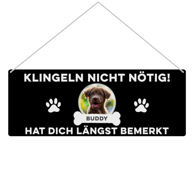 Bedrucktes Outdoorschild mit lustigem Spruch - Klingeln Nicht Nötig - mit Fotos & Namen - als Türschild, Torschild, Gartenschild an der Gartentür oder der Haustür verwendbar - besonders stabil und kratzfest aus Aluminium. Dieses personalisierte Schild ist ein ideales Geschenk für Hundebesitzer und Hundefreunde.