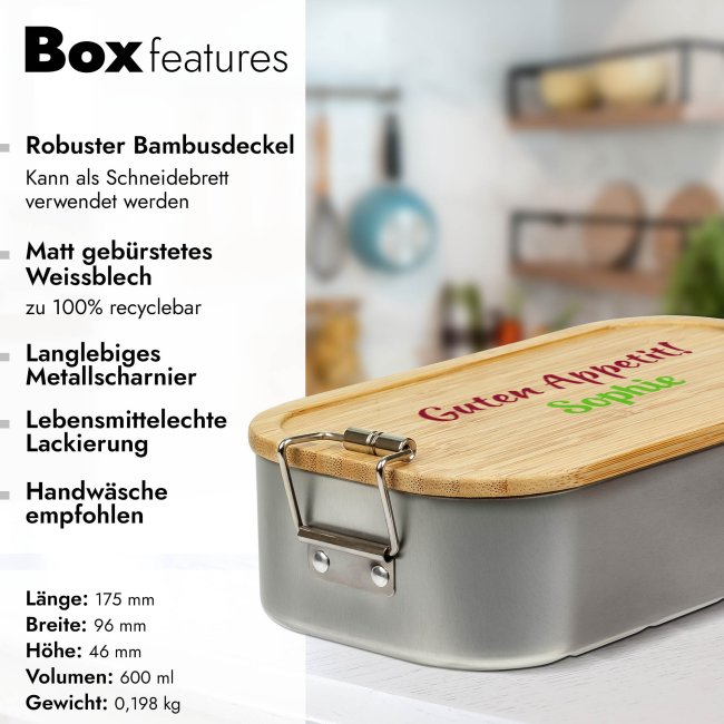 Wenn Sie auf der Suche nach einem besonderen Geschenk sind, dann ist diese personalisierte Brotdose „Schulkind“ mit süßem Tiermotiv eine großartige Wahl - Es stehen Ihnen 5 verschiedene Tiermotive zur Auswahl. Die Geschenkidee zur Einschulung für Jungs und Mädchen. Für eine persönliche Note wird die Brotbox mit dem Namen des Kindes und dem Jahr zum ersten Schultag bedruckt. So wird auch eine Verwechslung in der Schule ausgeschlossen. Unsere personalisierte Lunchbox ist von höchster Qualität und wird Erstklässler-Augen strahlen lassen! Eine einzigartige und persönliche Geschenkidee für alle Schulanfänger - für Jungen und Mädchen. Nicht nur optisch ein Hingucker, sondern auch praktisch ist unsere bedruckte Brotdose zum Schulbeginn. Die Lunchbox hat einen robusten Bambusdeckel und bietet mit 600 ml genügend Platz für das Schulbrot. Überraschen Sie Ihr Kind oder einen kleinen Schulanfänger mit dieser praktischen und umweltfreundlichen Brotdose. Diese überzeugt durch matt gebürstetes Weißblech, welches zu 100% BPA- und Plastikfrei ist. Der robuste Deckel aus Bambusholz kann auch als Schneidebrett verwendet werden. Dank der seitlichen Klemmbügel lässt sich die Box leicht verschließen, damit der Inhalt frisch bleibt und nicht austrocknet. Süßes kindliches Design, praktisch und umweltbewusst - Die personalisierte Idee mit Namen und Jahr als Einschulungsgeschenk ist für die Schule, Ausflüge oder Outdoor Aktivitäten jeglicher Art besonders gut geeignet. Entdecken Sie unsere selbst gestaltetes Brotdose für den Schulstart!