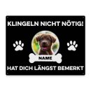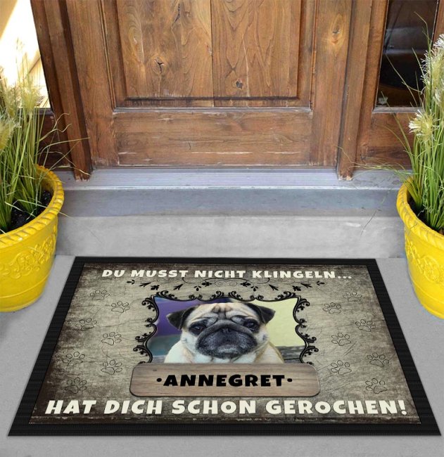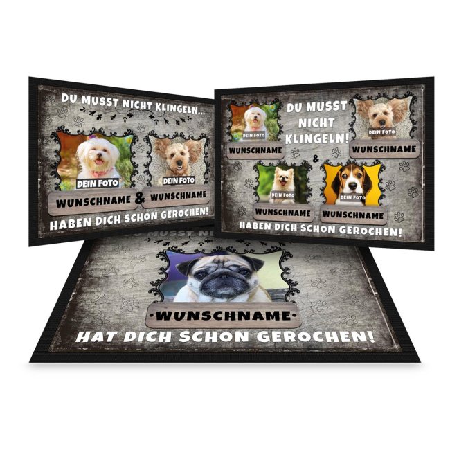Du bist Hundebesitzer und möchtest das auch gleich Deinem Besuch an der Wohnungstür übermitteln? Dann gestalte hier Deinen eigenen Willkommen Fußabtreter für die Eingangstür mit persönlichem Hundefoto und dem Hundenamen Deines Lieblings! Die Fußmatte mit Spruch - Du musst nicht klingeln, wir haben Dich schon gerochen - mit den Fotos Deiner Hunde kannst Du mit den Hundenamen ergänzen. Die personalisierte Türmatte ist eine tolle Geschenkidee für Hundebesitzer. Sie hält den Schmutz draußen und ist gleichzeitig ein Hinweis auf die felligen Mitbewohner.