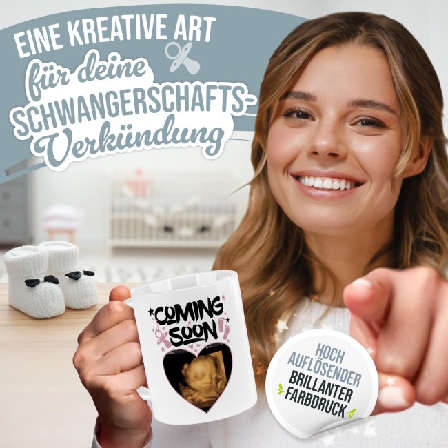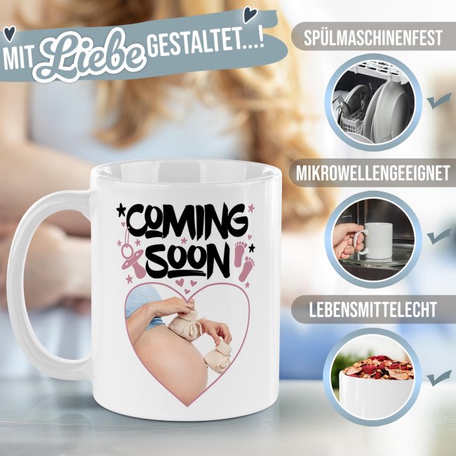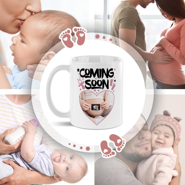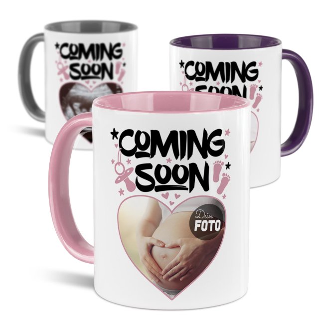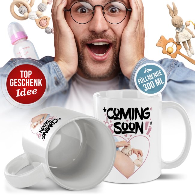 Personalisierte Tasse - Coming soon, rosa - mit Foto