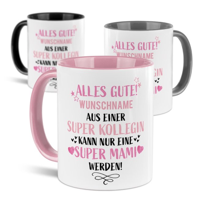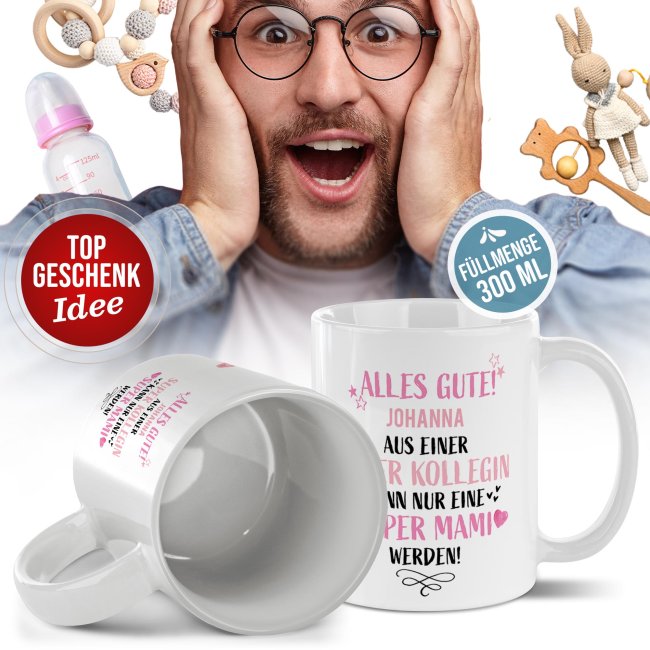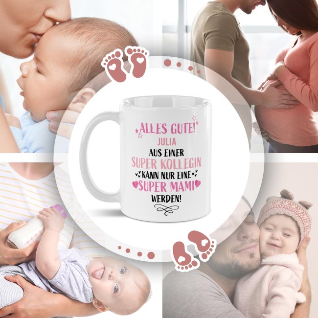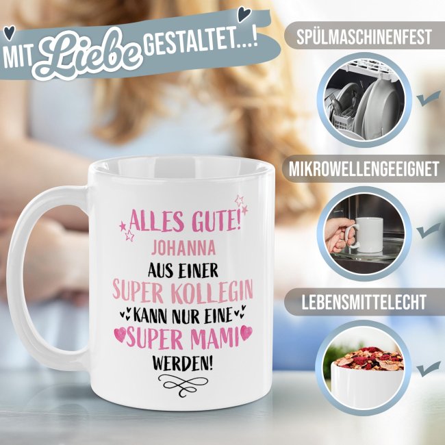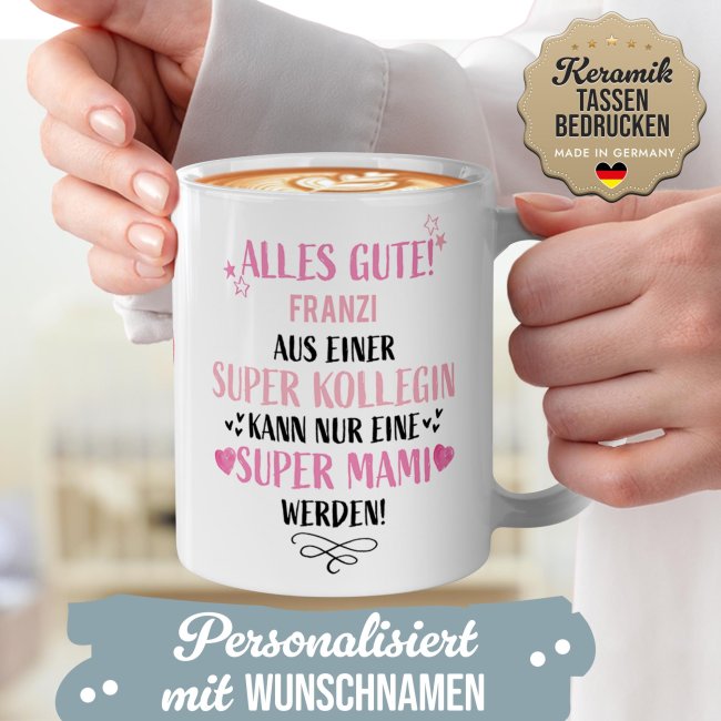 Mit dieser liebevoll gestalteten Tasse zeigen Sie Ihrer Kollegin auf ganz persönliche Weise, wie sehr Sie sich mit ihr freuen. Der Spruch "Aus einer super Kollegin kann nur eine super Mami werden" trifft mitten ins Herz - und dank Wunschname wird aus der Keramiktasse ein einzigartiges Erinnerungsstück. Ideal als Aufmerksamkeit zur Schwangerschaft, zur Babyparty oder einfach als süßer Gruß für die werdende Mama. Gestalten Sie diese Tasse und zaubern sie ein Lächeln aufs Gesicht der werdenden Mutter - Weil die Kollegin einfach eine wundervolle Mama wird!
