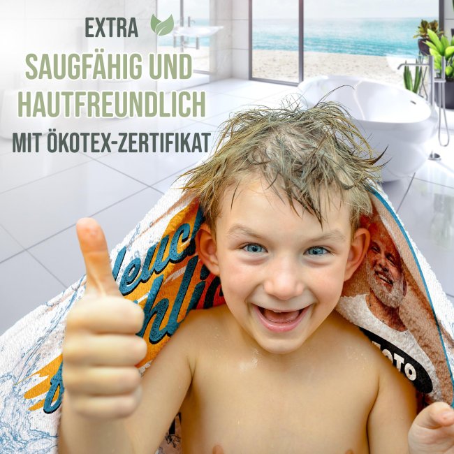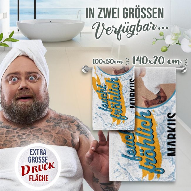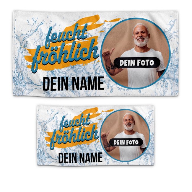 Du suchst nach einem witzigen aber auch praktischen Geschenk? Dann bist du mit unserem personalisierten und hochwertigen Handtuch bestens beraten. Unser Badehandtuch mit dem Aufdruck - Feucht Fröhlich - wird mit deinem Lieblingsfoto und Namen bedruckt. Dieses Strandtuch, ist der beste Begleiter im Urlaub, Fitnessstudio oder als Saunahandtuch. Die Vorderseite des Handtuchs besteht aus 100% bedruckbarer Mikrofaser und die Rückseite aus Baumwolle. Gestalte hier dein lustiges Handtuch ganz einfach selbst!