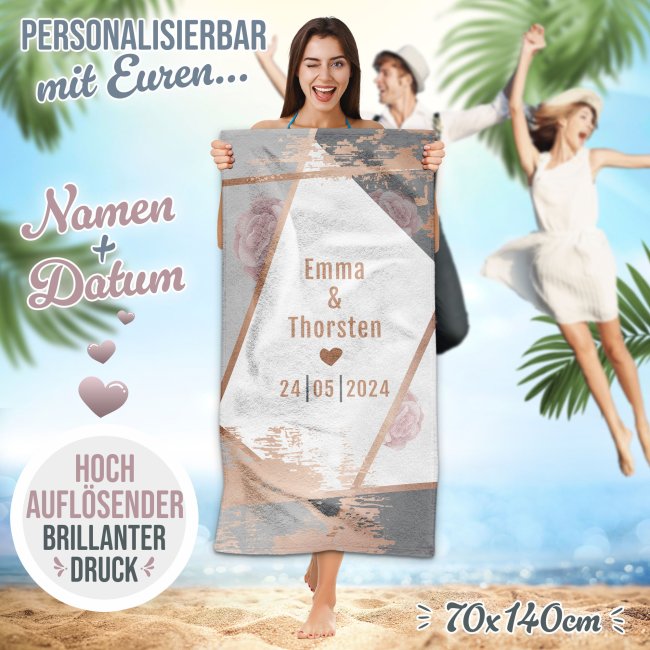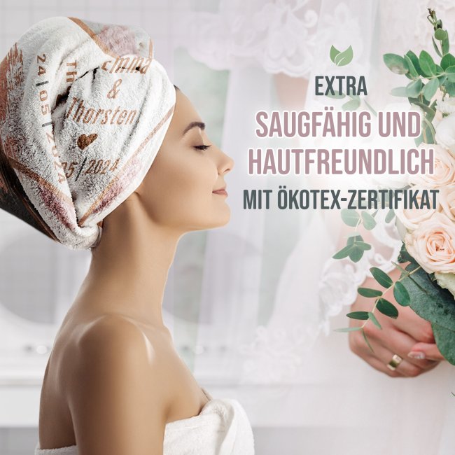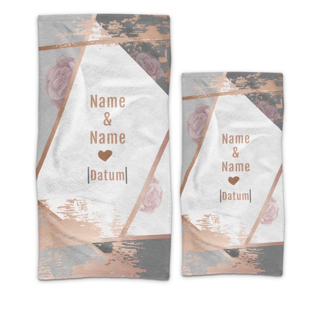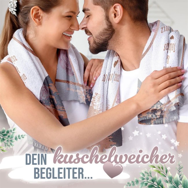 Ein Hochzeitsgeschenk zu finden, das sowohl praktisch als auch besonders ist, kann eine Herausforderung sein. Personalisierte Handtücher sind ein individuelles, zeitloses Geschenk für jedes Brautpaar. Gestalte hier dieses einzigartige, liebevoll gestaltete Handtuch als Geschenk zur Hochzeit, indem du die Handtücher mit den Namen des Brautpaares und dem Hochzeitsdatum bedrucken lässt. Eine tolle Erinnerung an den Hochzeitstag. Der brillante Druck ist langlebig und sehr waschbeständig.