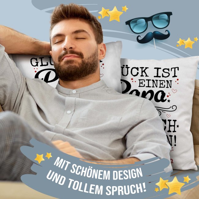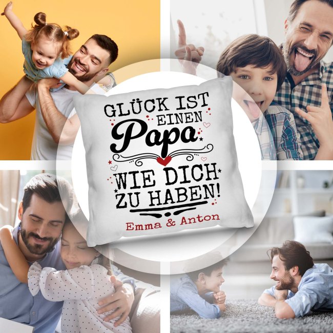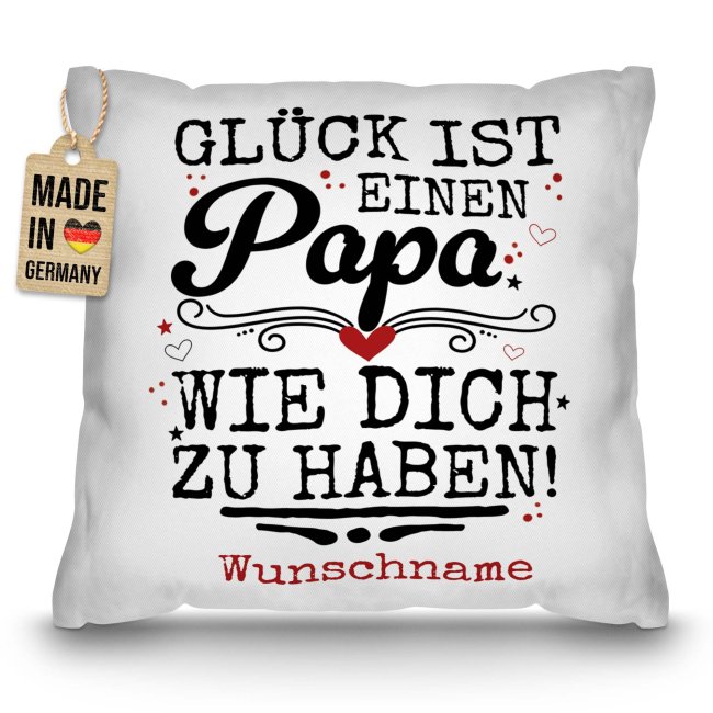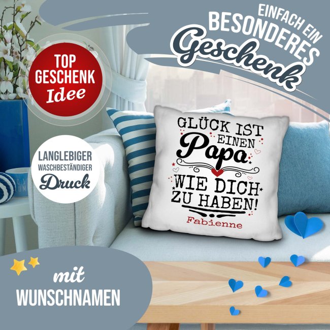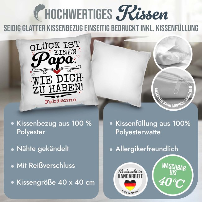 Unser hochwertig bedrucktes Kissen ist ein einzigartiger Hingucker auf dem Sofa, Sessel oder Lieblingsplatz. Das hochwertige Kissen - Glück ist einen Papa wie dich zu haben - wird mit dem Wunschnamen oder Wunschtext bedruckt und erhält so den persönlichen Touch. Das perfekte Geschenk für Papa, zum Vatertag, Geburtstag oder Weihnachten. Das personalisierte Kissen wird komplett mit passender Kissenfüllung geliefert. Durch den hochwertigen Fotodruck kommen alle Farben äußerst realistisch, lebhaft und brillant aus unserer hauseigenen Produktion - Made in Germany. Werden Sie kreativ und verschenken Sie die schönsten Erinnerungen auf einem einzigartigen Fotokissen.