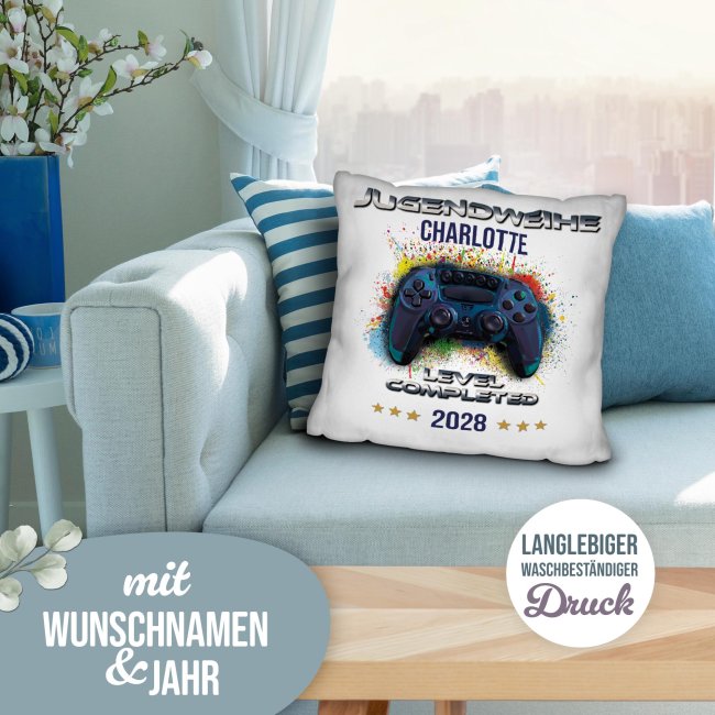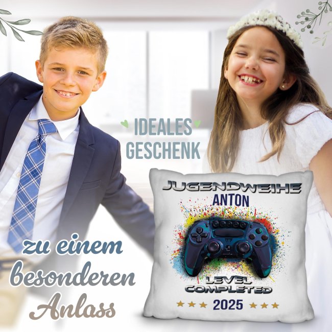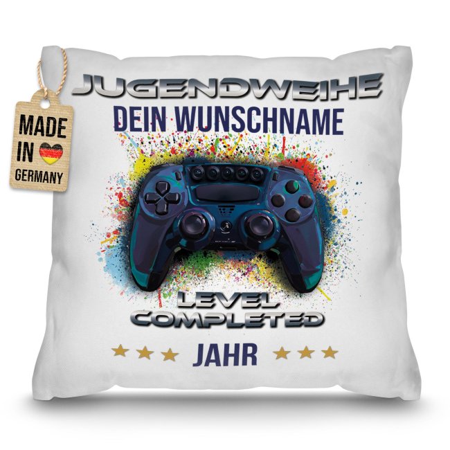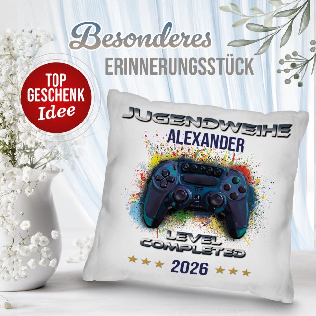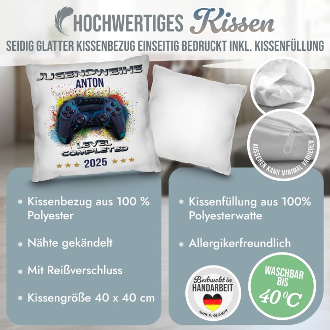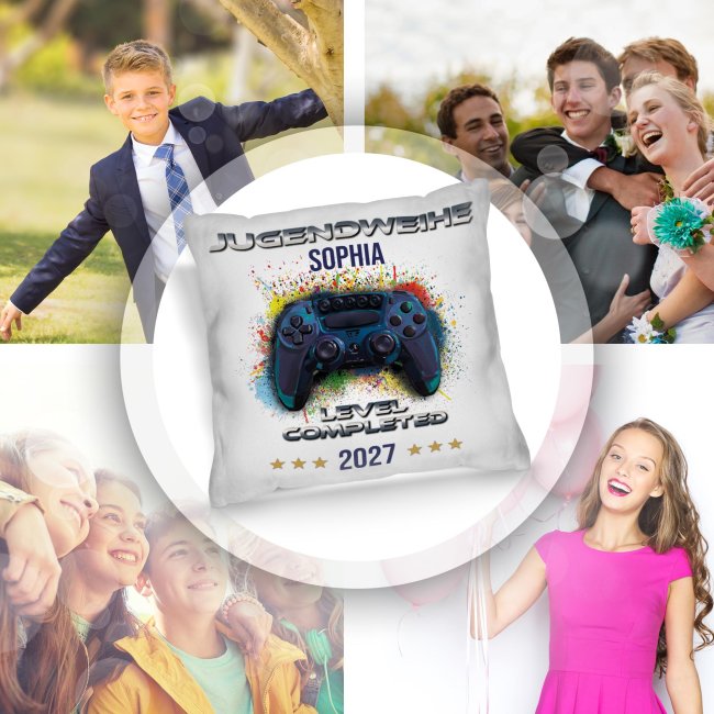 Das personalisierte Kissen in weiß mit Name und Jahr "Level completed" ist die perfekte Geschenkidee zur Jugendweihe. Es ist nicht nur bequem und dekorativ, sondern dient auch als Andenken an diesen bedeutungsvollen Tag. Das Kissen wird mit Ihrem Wunschname und Jahr bedruckt und ist ein liebevolles Geschenk. Das Kissen ist ein symbolisches Geschenk, das die Bedeutung dieses Ereignisses hervorhebt. Der Bezug mit einer Größe von 40 x 40 cm ist pflegeleicht, bis 40 Grad waschbar und hat einen hochwertigen Reißverschluss. Um den Druck zu schonen, sollte der Bezug beim Waschen gewendet werden. Die Füllung aus 100 % Polyesterwatte wird direkt mitgeliefert. Verschenken Sie das personalisierte Fotokissen zur Jugendweihe.
