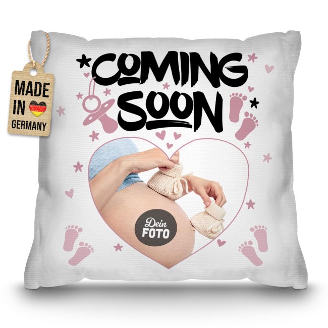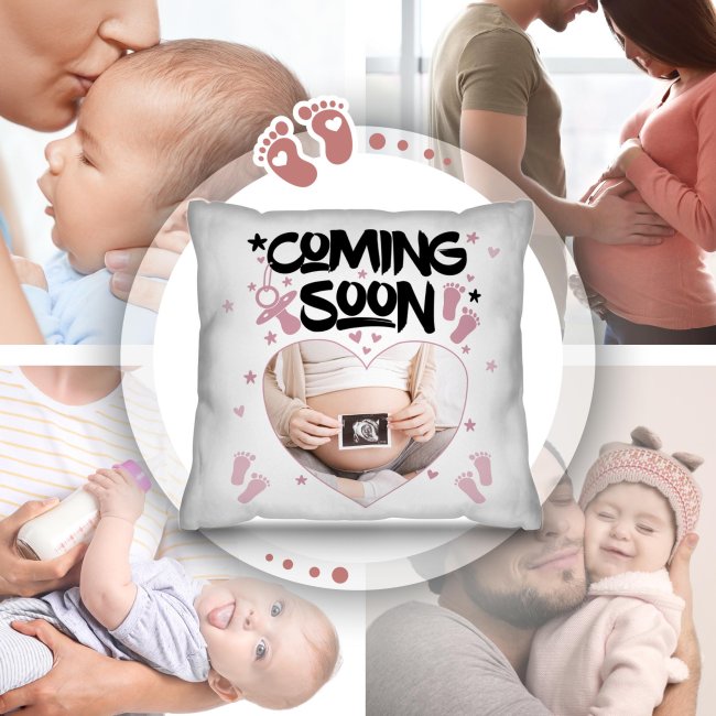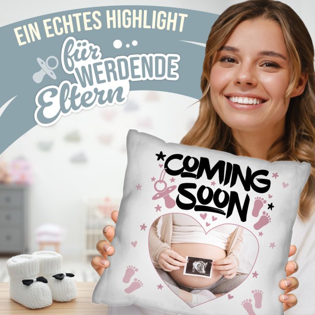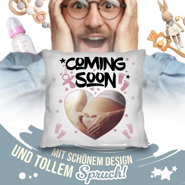 Hurra! Sie sind schwanger und wollen die frohe Botschaft mit der Familie teilen? Dann ist dieses Kissen mit Spruch "Coming Soon" genau das Richtige! Das Kissen bietet Platz für Ihr individuelles Foto - ob Ultraschallbild oder Babybauchfoto. Das hochwertige Fotokissen ist die perfekte Geschenkidee für eine emotionale Schwangerschaftsverkündung für den werdenden Papa, die zukünftigen Großeltern, Geschwister oder enge Freunde. Machen Sie aus der freudigen Nachricht ein unvergessliches Ereignis! Das Babynews-Kissen - ideal für die Schwangerschaftsverkündung und ein liebevolles Geschenk.