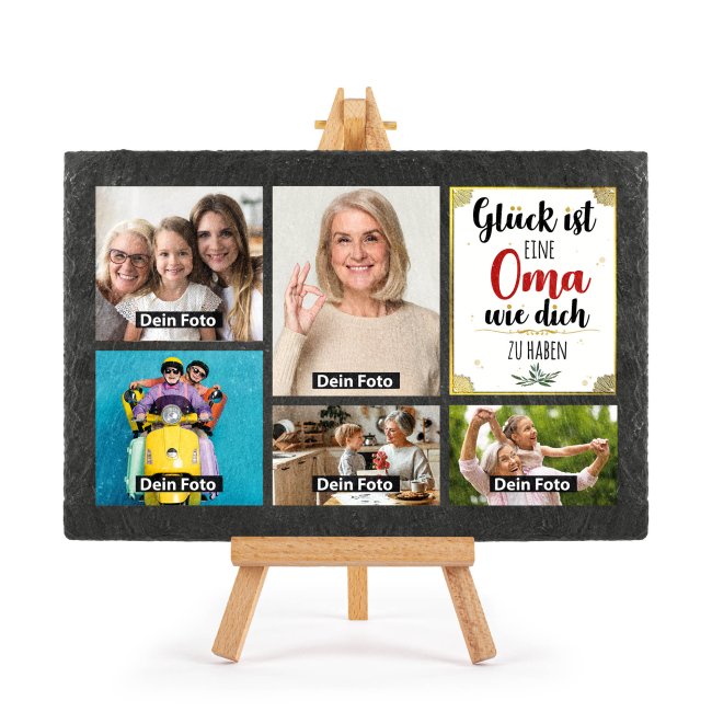 Glück ist, eine Oma wie Dich zu haben! Ein sehr persönliches Geschenk für Oma ist diese exlusive und individuell gestaltbare Schiefersteinplatte. Die Schiefertafel inklusive passender Holzstaffelei, bedruckt mit Ihren Lieblingsfotos für Oma, ist eine tolle Geschenkidee zum Muttertag oder zum Jahrestag - auch als Geburtstagsgeschenk oder ganz besonderes Weihnachtsgeschenk für die Großmutter. Die hochwertige Schieferplatte ist ein Naturprodukt und wird in zwei Größen angeboten. Kleine Unregelmäßigkeiten in der Oberfläche sind gewollt. So kommen die Fotos in besonderer Art und Weise zur Geltung.