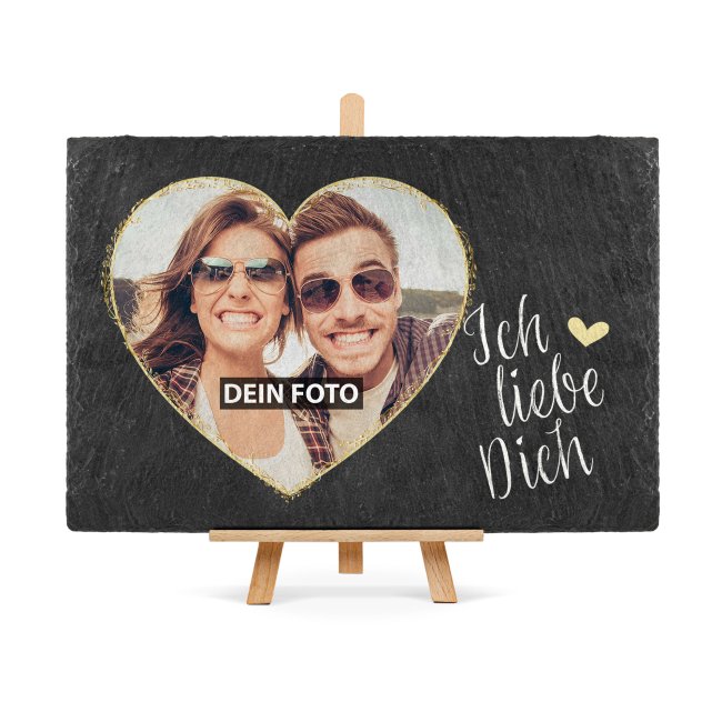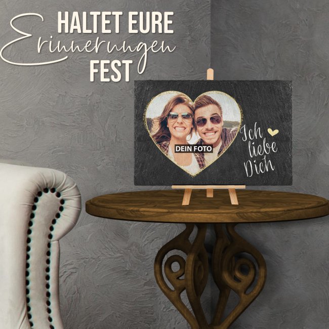 Hochwertige, edle Schiefertafel mit Fotocollage als Geschenk für die Partnerin oder den Partner - eine besondere Liebeserklärung zum Valentinstag, zum Jahrestag oder zum Hochzeitstag. Die schicke, liebevoll gestaltete Schiefertafel - Ich liebe Dich - ist personalisierbar mit einem besonderen Paarfoto. Wähle zwischen zwei Varianten - entweder zum Aufhängen oder zum Aufstellen auf einer Holzstaffelei. Das perfekte Geschenk für den Schatz - eine tolle Erinnerung und besondere Liebesbotschaft auf natürlichem Schieferstein.