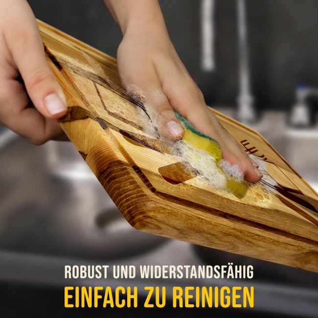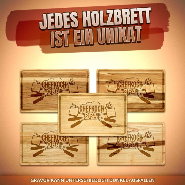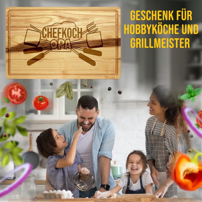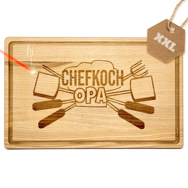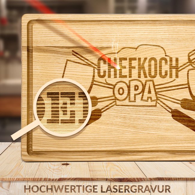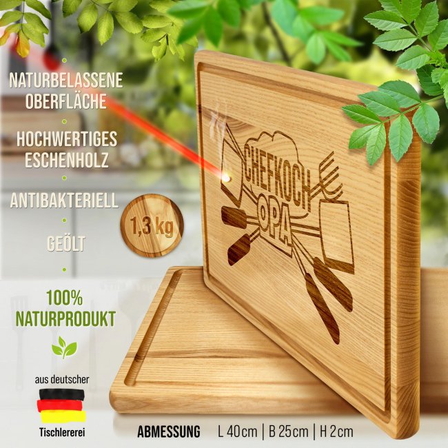 Ein personalisiertes Schneidebrett aus richtig gutem Echtholz ist ein persönliches und hochwertiges Geschenk für Opa den Hobbykoch in der Familie - perfekt als besonderes Weihnachtsgeschenk für Opa, der gern kocht. Das Schneidebrett mit Gravur lässt sich zu jedem Anlass verschenken - als Geburtstagsgeschenk für Opa macht mit diesem hochwertigen Holzbrett die Schnibbelarbeit beim Kochen endlich richtig Spaß. Das geölte Schneidebrett aus Kerneschenholz ist sehr robust und widerstandsfähig - perfekt zum Schneiden und Anrichten Deiner Lebensmittel. Für unser langlebiges Brett aus Eschenholz empfehlen wir Handwäsche und die Trocknung an der Luft! Da das Schneidebrett geölt ist, ist die naturbelassene Oberfläche geschützt und antibakteriell. Zusätzlich kannst Du es von Zeit zu Zeit zum Versiegeln mit Speiseöl einreiben, was das Küchenbrett besonders langlebig macht. Wir empfehlen Leinöl, da dies mit der Zeit aushärtet und sich nicht ölig anfühlt.