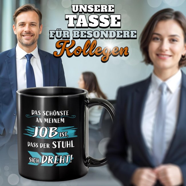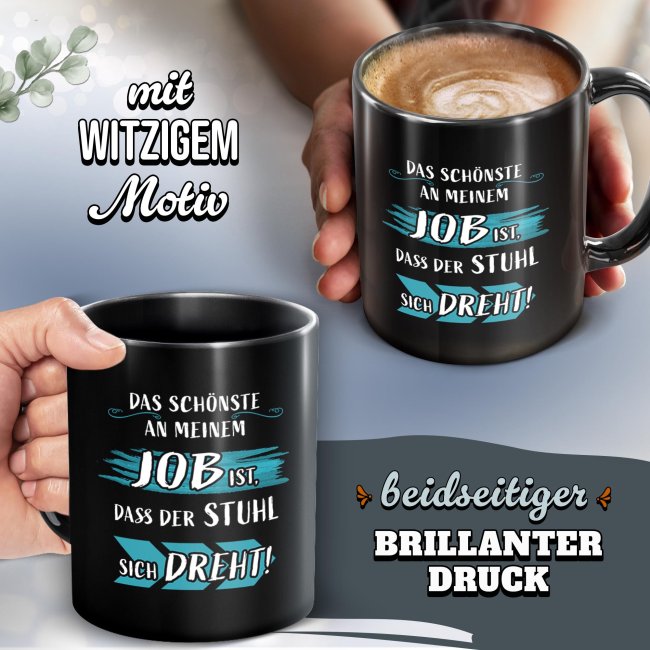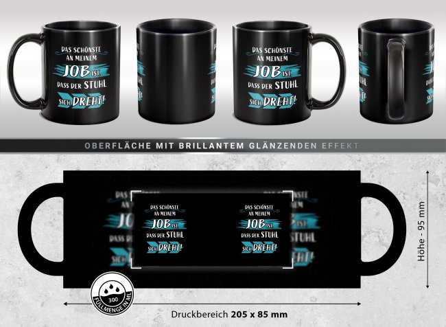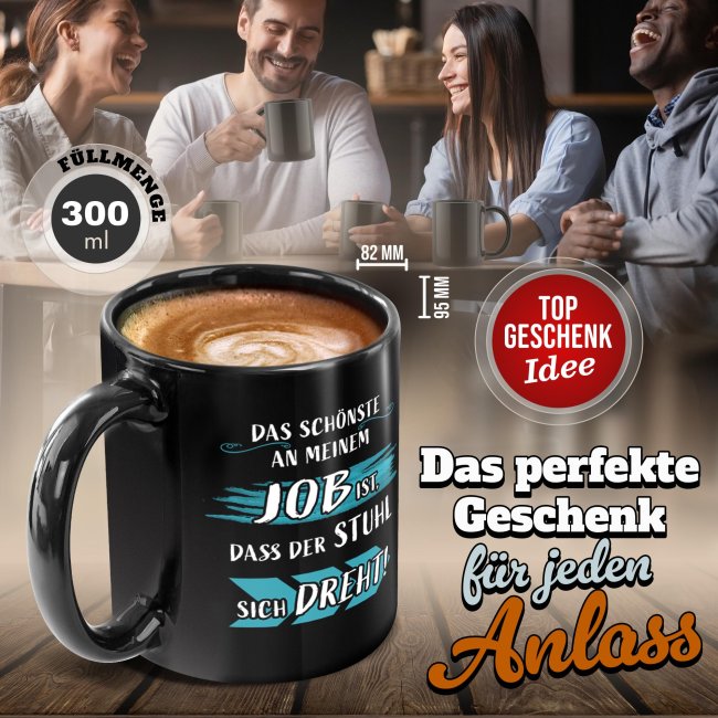 Diese Tasse feiert nicht den Job - sondern den bequemen Stuhl, der sich auf noch dreht. Die schwarze Keramik Tasse ist ideal für alle, die mit einem Augenzwinkern durch den Arbeitstag gehen. Kaufe die Tasse für dich selbst oder verschenke sie an Freunde, Familie oder Kollegen - eine witzige Geschenkidee passend zu jedem Anlass. Ein Lacher ist dir definitiv sicher!