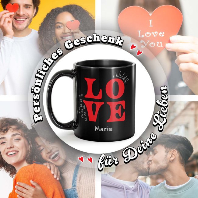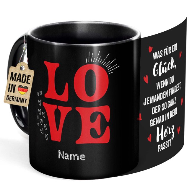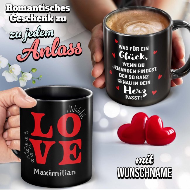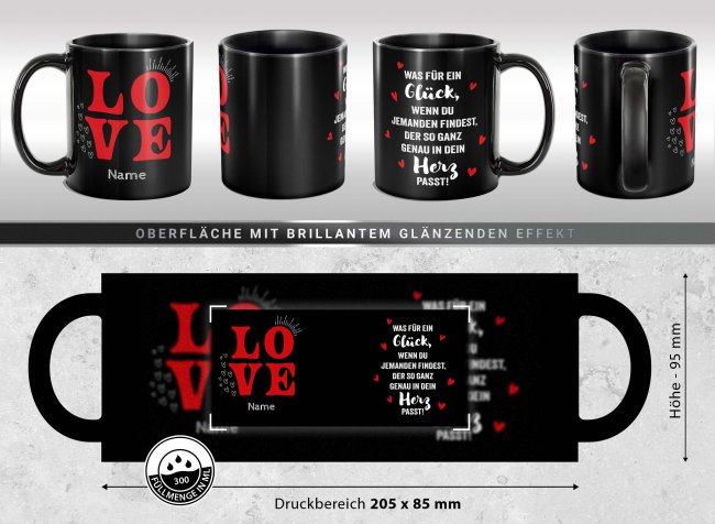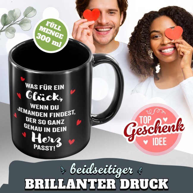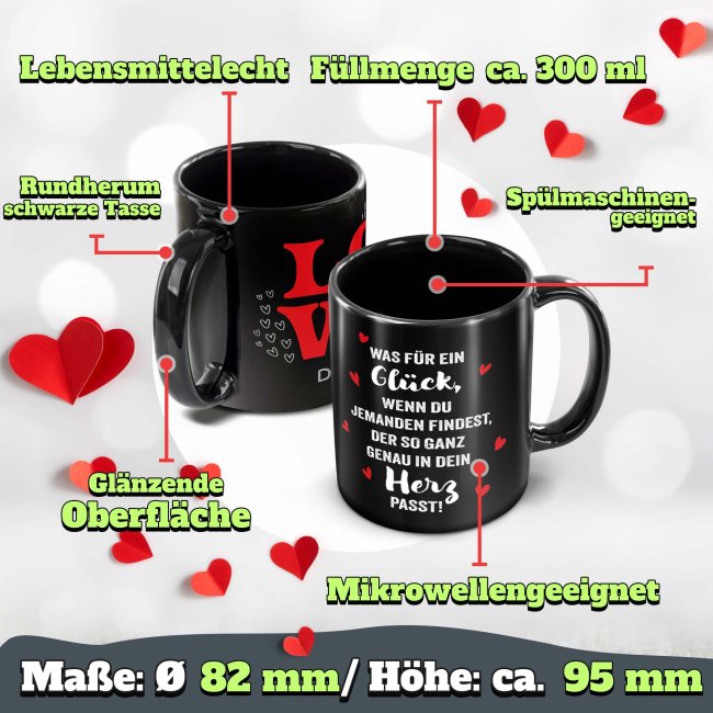 Suchen Sie ein romantisches Geschenk, das von Herzen kommt? Dann verschenken Sie Liebe in Form unserer stilvollen schwarzen Keramiktasse! Diese hochwertige, glänzende Tasse mit Spruch - Jemand der in dein Herz passt - wird mit Ihrem Wunschnamen personalisiert und erhält somit den ganz persönlichen Touch. Die Tasse ist das perfekte Geschenk zum Valentinstag, Jahrestag oder Geburtstag. Unsere Tasse besteht aus langlebiger, hochwertiger Keramik in edlem Schwarz. Sie ist spülmaschinenfest (mehr als 2000 Spülungen!) und mikrowellengeeignet, was sie perfekt für den täglichen Gebrauch macht. Dank dem süßen Motiv und der freien Gestaltung ist sie eine einzigartige und persönliche Liebeserklärung, die jeden Morgen versüßt.