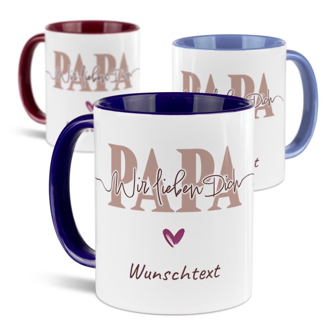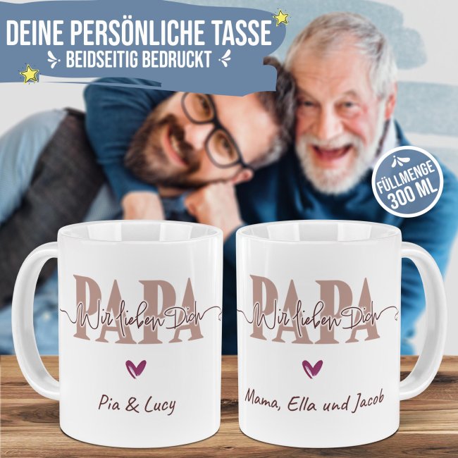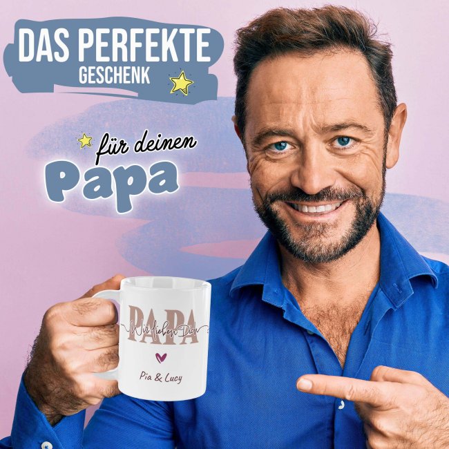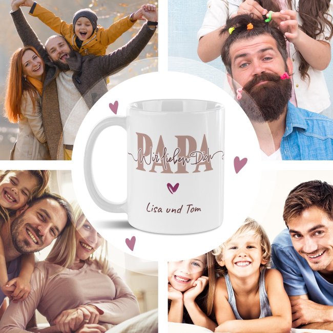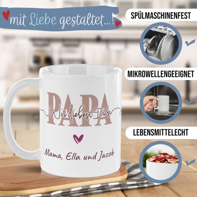 Unser hochwertig bedruckte Tasse ist ein einzigartiger Hingucker auf jedem Küchentisch - ob Zuhause oder im Büro. Die Keramik Tasse mit Spruch - Papa wir lieben dich - wird mit dem Wunschnamen oder Wunschtext bedruckt und erhält so den persönlichen Touch. Das perfekte Geschenk für Papa, zum Vatertag, Geburtstag oder Weihnachten. Die personalisierte Tasse ist durch den brillanten Druck links und rechts vom Henkel sowohl für Links- auch als für Rechtshänder geeignet. Alle Farben kommen äußerst realistisch, lebhaft und brillant aus unserer hauseigenen Produktion - Made in Germany. Werden Sie kreativ und verschenken Sie die schönsten Erinnerungen auf einer einzigartigen Tasse für Papa.