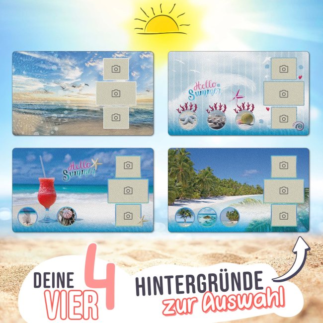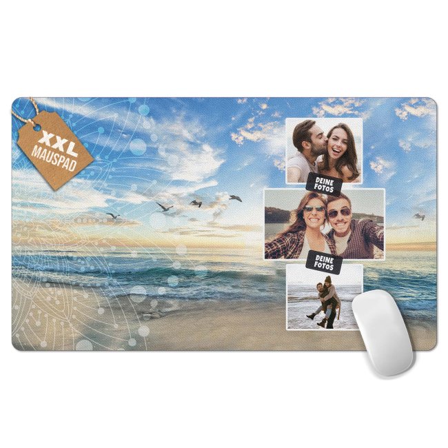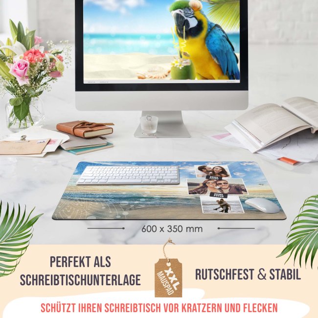 Gestalten Sie hier ein ganz persönliches Mousepad nach Ihren Wünschen - mit Urlaubsmotiv als Hintergrund, wählbar aus 2 verschiedenen Größen, personalisierbar mit drei Fotos. So erfreuen Sie sich oder die Beschenkten jeden Tag bei der Arbeit oder im heimischen Büro - das selbst gestaltete Mousepad mit Fotocollage, nicht nur hübsch sondern auch praktisch. Die sanfte und gleichzeitig rutschfeste Textur sorgt für ein reibungsloses Gleiten deiner Maus. Ideale Geschenkidee für Freunde und Familie oder als Ergänzung für Ihr eigenes Büro - dieses Mousepad in XXL-Format hat die perfekte Größe für jeden Schreibtisch. Gestalten Sie hier Ihr individuelles Mousepad und verschenken Sie Freude. So ist der morgendliche Start in den Büroalltag erträglicher.