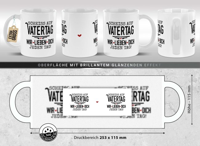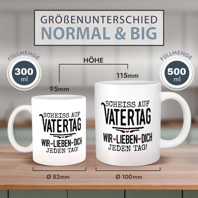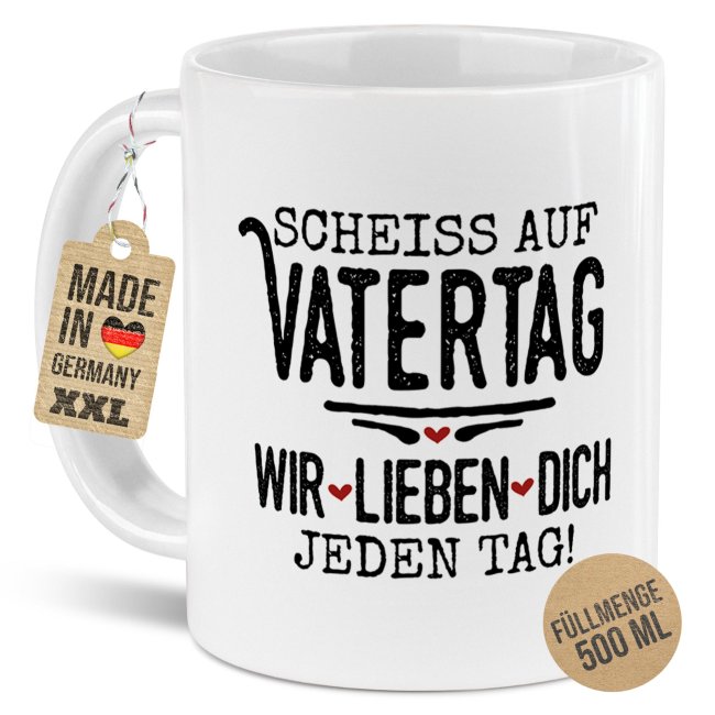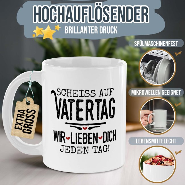 Die XXL-Tasse ist das ideale Geschenk für alle Papas mit großem Kaffee-Durst. Die BIG-Tasse mit lustigem Spruch "Scheiß auf Vatertag, wir lieben dich jeden Tag" ist die perfekte Geschenkidee zum Vatertag. Die XXL-Keramiktasse fasst 500 ml, ist spülmaschinenfest, mikrowellengeeignet und wird in Deutschland hergestellt. Die witzige Spruchtasse als perfektes Vatertagsgeschenk.