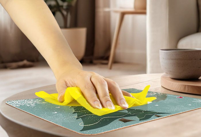 Die Oberfläche der personalisierten Tischsets ist abwischbar und besonders pflegeleicht; das Design wird durch eine glänzende Klarlackbeschichtung geschützt, die zudem für zusätzliche Langlebigkeit sorgt.