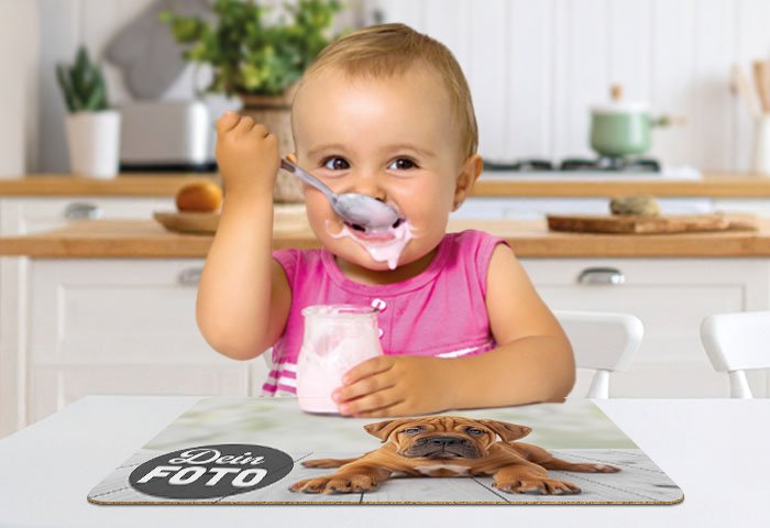 Die Oberfläche der personalisierten Platzsets besteht aus glattem Kunststoff und ist dadurch abwischbar; die rutschfeste Unterseite aus Kork. Unsere Tischsets zum selbst gestalten sind lebensmittelecht und BPA-frei.
