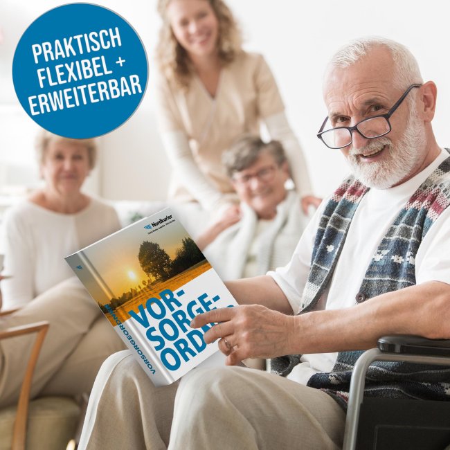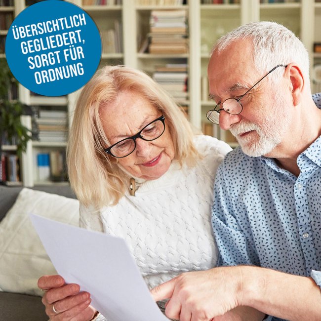 Der Vorsorgeordner – alles bedacht! Finanzen, Vollmachten, Patientenverfügung, Testament und mehr – mit dem Vorsorgeordner sind Ihre wichtigen Unterlagen übersichtlich organisiert. Wir haben an alles gedacht, Sie müssen sich nur noch ans Ausfüllen machen. Danach können Sie Unvorhergesehenem entspannt entgegenblicken: Ihre Vorsorge ist geregelt.